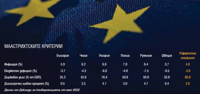 По частта за стабилност на цените обаче България не покрива критерия, и то с много. Дори и услужливият трик на Еврокомисията да изключи от сметката Малта и Португалия, страните с най-ниска инфлация в еврозоната, като "нетипични" примери, не помага. Благодарение на него референтната горна граница за инфлацията става 4.9%. Но към май 2022, датата на приемане на последния конвергентен доклад, инфлацията в България е 5.9%. А при следващия доклад тя ще е още по-висока.