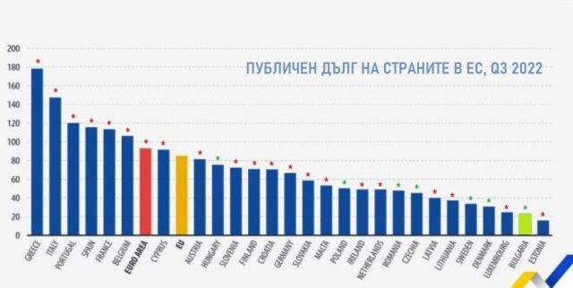 Публичният дълг на страните от ЕС като % от БВП към края на третото тримесечие на 2022. С червена звездичка са отбелязани страните от еврозоната, със зелена - тези извън нея. България е предпоследна от ляво на дясно. Средният дълг на страните от еврозоната е 92.9% от техния БВП, а на този извън еврозоната - 43.6%, над двойно по-нисък