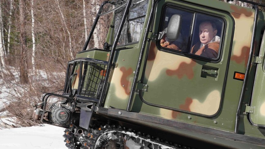 На предоставените от Кремъл кадри и и излъчени по телевизиите, се вижда как той кара високопроходим автомобил и се разхожда из снежната планина в компанията на военния министър Сергей Шойгу.
