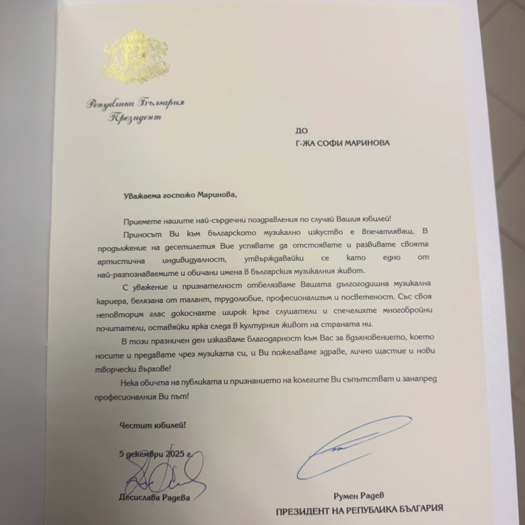 "Благодаря на президента на Република България, г-н Румен Радев и съпругата му Десислава Радева, за уважението! Благодаря на великата Лили Иванова за прекрасните цветя, за доброто отношение и за всяка изпята песен, която е докосвала сърцето ми", написа тя в социалните мрежи.