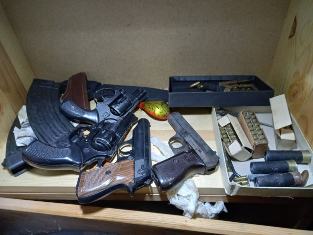 Намерени и иззети са и оръжия - 3 газови и 1 боен пистолет, въздушна пушка, както и множество боеприпаси, всички те без съответните документи, изисквани по закон.