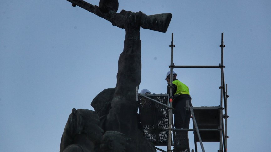 Скеле, работници и недоволни граждани... Демонтират Паметника на Съветската армия