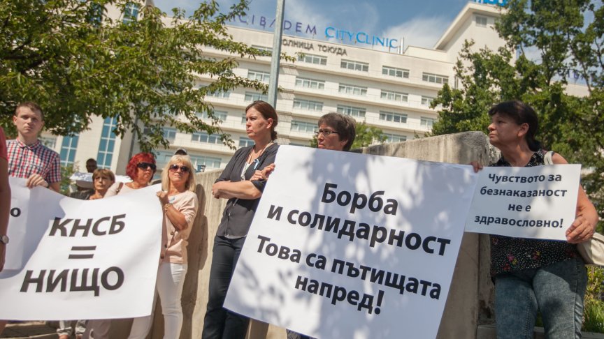 Протест в подкрепа на медицинската сестра Мая Илиева се проведе днес пред столичната болница "Токуда". Протестиращите се обявиха и срещу синдикатите.