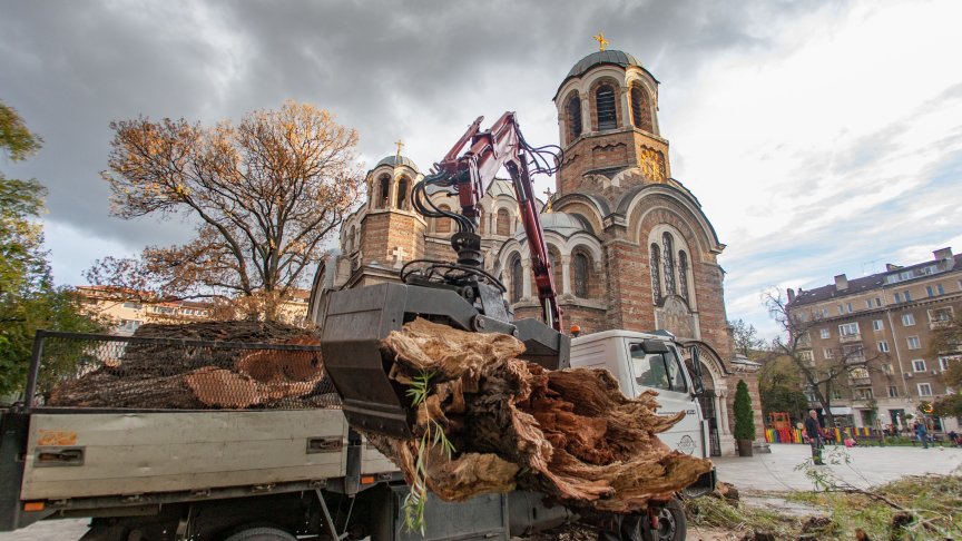 Служители на Столичната община нарязаха и разчистиха падналия ствол на дървото.