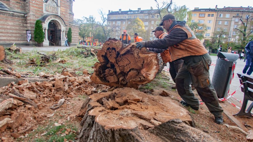 Служители на Столичната община нарязаха и разчистиха падналия ствол на дървото.