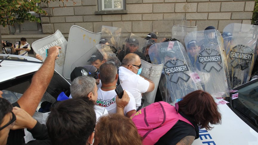 Протестиращите се опитват да пробият полицейския кордон, за да стигнат до входа на бившия Партиен дом. Жандармеристи застанаха на първа линия между протестиращите и полицаите. Депутатите бяха докарани на групи с бусове, за да могат да влязат безопасно в сградата на бившия Партиен дом.