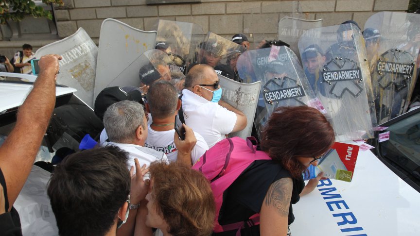 Протестиращите се опитват да пробият полицейския кордон, за да стигнат до входа на бившия Партиен дом. Жандармеристи застанаха на първа линия между протестиращите и полицаите. Депутатите бяха докарани на групи с бусове, за да могат да влязат безопасно в сградата на бившия Партиен дом.