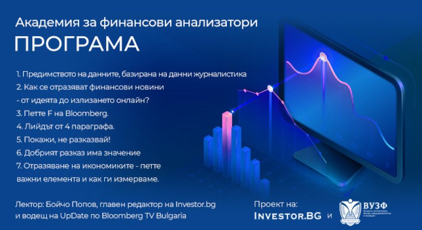 Инициативата "Академия за финансови анализатори“ на Investor.bg се организира съвместно с бизнес университета ВУЗФ по повод 20-тата годишнина на икономическата медия. Нейната мисия е да помогне на млади таланти с интерес към финансовата и икономическата журналистика да обогатят знанията си и да се специализират, учейки се от най-добрите бизнес журналисти в България и техния опит.