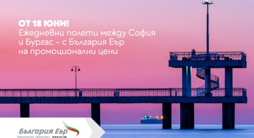 Националният превозвач разшири лятната си кампания още повече, като включи промоционални цени на билетите и по друга морска линия – тази между София и Бургас. Сезонните полети между столицата и черноморския град стартират на 18 юни, а за резервации до 20 юни еднопосочните билети по линията се предлагат на атрактивни цени 27 евро за еднопосочно и 55 евро за двупосочно пътуване.