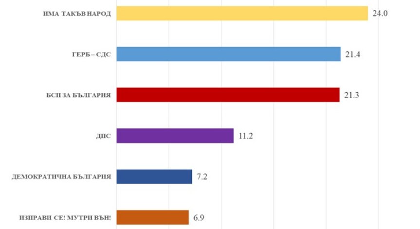 Битката за първото място в предстоящите избори тепърва предстои. "Има такъв народ" изпреварва с около 3% основните си опоненти – ГЕРБ и БСП, които са с практически изравнени позиции, показва проучване на агенция "Медиана".