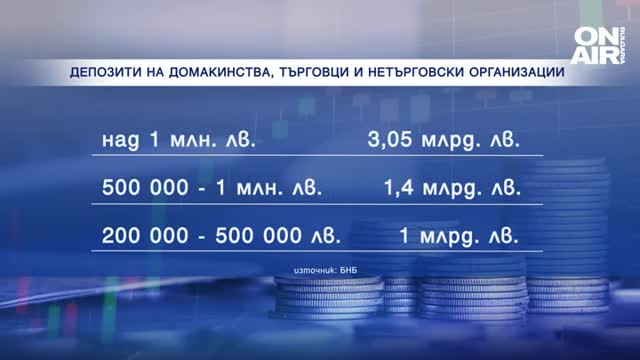 Според данните на БНБ за този период влоговете на домакинствата с над 1 млн. лв. са се увеличили с 208. Значително нарастване за второто тримесечие има и при спестените между 500 000 и 1 млн. лв. в една сметка - бройката им се е вдигнала с 240. Така вече общата сума в сметките с над 1 млн. лв. надхвърля 3 млрд. лева, а в депозити между 500 000 и 1 милион лева - 1 милиард и 400 милиона лева.