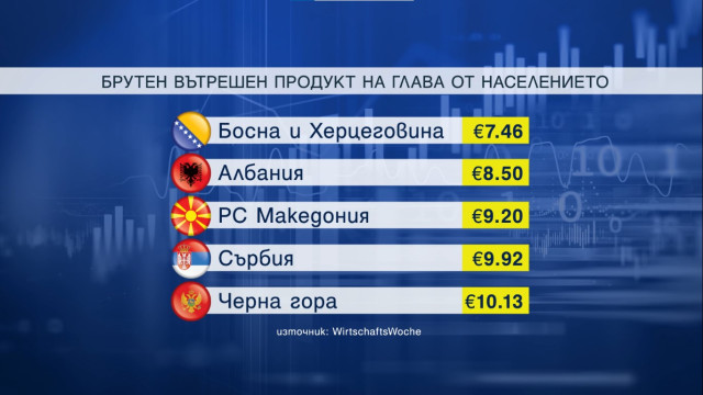 Първа е Босна и Херцеговина, която е най-бедната страна в Европа. БВП на глава от населението е 7,46 евро. Следва Албания с 8,50 евро. Република Северна Македония е третата най-бедна страна в Европа с БВП на глава от населението – 9,20 евро. Четвърта е Сърбия, следвана от Черна гора.