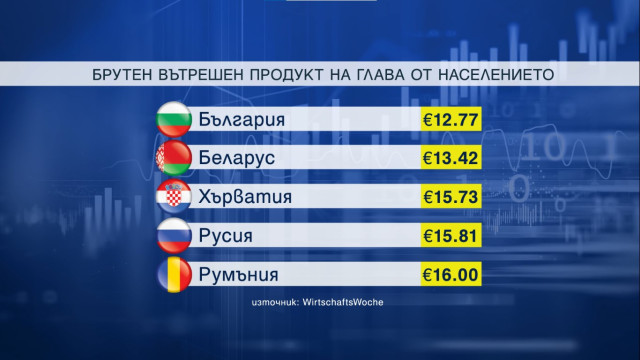 Шестото място е за България. Тя е една от най-бедните страни в Европа и най-бедната в Европейския съюз. У нас Брутният вътрешен продукт на глава от населението е 12,77 евро.