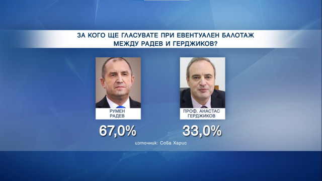 При евентуален втори тур на президентските избори Румен Радев има предимство пред Анастас Герджиков в съотношение 2:1. Според изследването настоящият държавен глава би получил 67% срещу 33 на сто за проф. Герджиков.