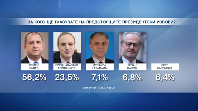 В президентския вот остава сериозна преднината на сегашния държавен глава Румен Радев. Според "Сова Харис" към момента той печели доверието на над 56% от решилите да гласуват.