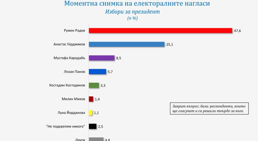 Ако изборите за президент и вицепрезидент бяха в последната седмица на октомври, за Румен Радев биха гласували 47,6% от гласуващите, за Анастас Герджиков – 25,1%, за Мустафа Карадайъ – 8,5%, за Лозан Панов – 5,7%, за Костадин Костадинов – 3,3%.