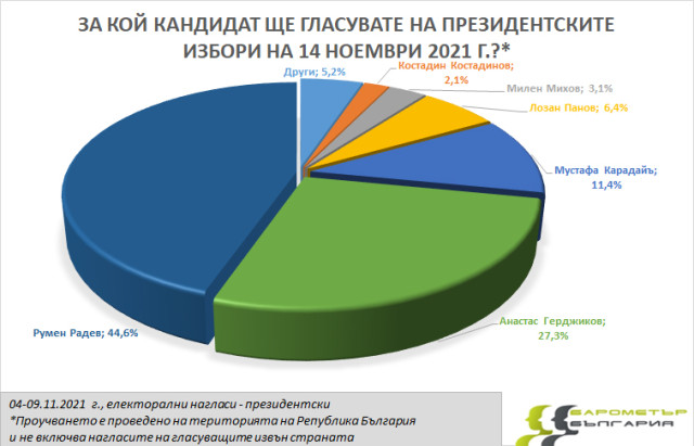 Седмица преди края на кампанията, Румен Радев продължава да заема водеща позиция с 44,6% подкрепа от анкетираните, макар и да търпи леки щети заради Ковид мерките на служебното правителство и въвеждането на т.нар. зелен сертификат. Настоящият президент почти със сигурност няма да спечели президентските избори на първи тур и ще участва в балотаж.