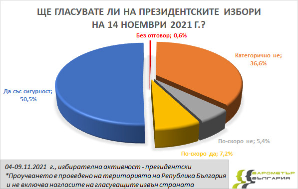 50,5% от анкетираните категорично заявяват, че ще гласуват и вече са избрали своя кандидат. 7,2% се колебаят, но са по-склонни да го направят. Нараства дела на тези, които по-скоро няма да отидат до урните – 5,4%. Категорично няма да го направят 36,6%.