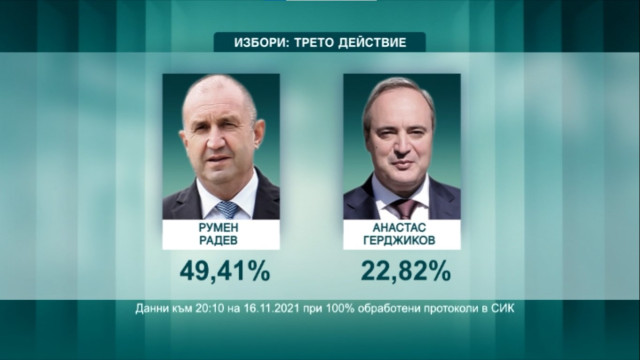 Румен Радев убедително води с малко под 50%, след него е Анастас Герджиков с 22,8%. Със значително по-нисък резултат са Мустафа Карадайъ, Лозан Панов и Костадин Костадинов.