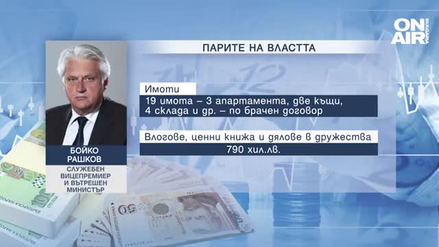Вътрешният министър Бойко Рашков е с рекордните 19 имота, но всички е декларирал като наследени по брачен договор. Влоговете му са за 790 хил.лв.