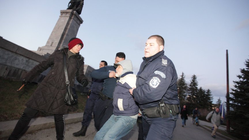 Част от хората, които бяха на протест пред руското посолство, се преместиха пред паметника. Един човек от протеста беше арестуван от полицията, но след известен престой в полицейската кола той беше освободен.