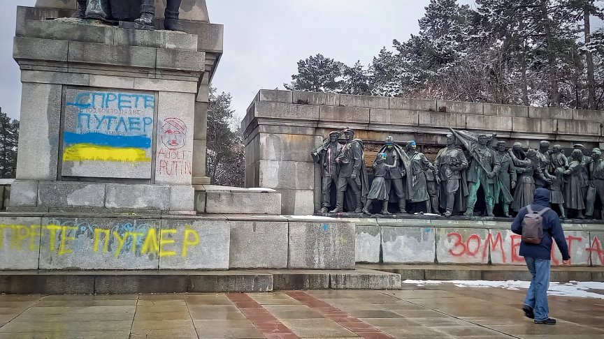 Графити срещу войната покриха още един паметник на загиналите съветски войници в София. Монументът "Братска могила" в Борисовата градина осъмна с украинското знаме и надпис "Спрете Путин".