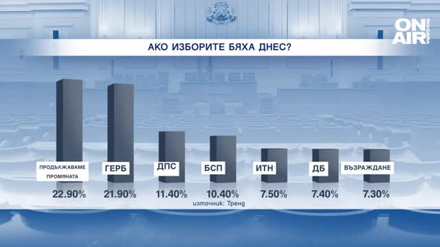 Спад в подкрепата към правителството. "Продължаваме промяната" и ГЕРБ са вече с минимална дистанция помежду си. Това сочи проучване на "Тренд", финансирано от вестник "24 часа", направено от 5 до 12 март, сред 1007 анкетирани.