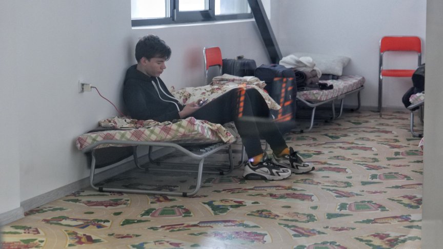 В спалното помещение влизат и излизат хора през целия ден. Част от тях се настаняват и единственото, което могат да направят, е да чакат - автобус, уреждане на документите си, края на войната. Тук са и 14-годишният Никита, заедно с майка му.