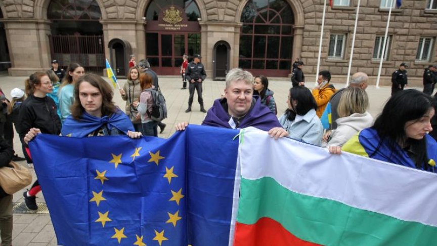 Шествие за военна помощ и солидарност с Украйна се провежда в София. Хората се събират пред президентството.