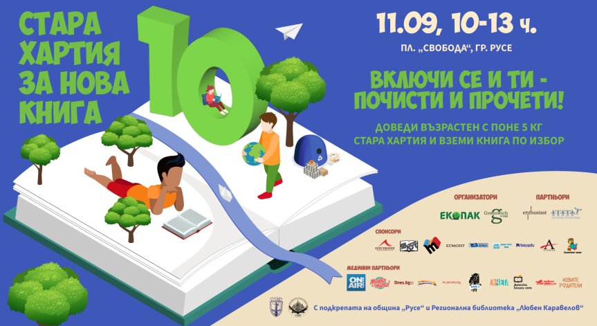 За седми път Русе ще бъде домакин на националната инициатива "Стара хартия за нова книга", която се провежда с подкрепата на Община Русе и Регионална библиотека "Любен Каравелов". Кампанията, организирана от "ЕКОПАК България" и Книжен център "Гринуич" под надслов "Почисти и прочети", насърчава грижата към природата и любовта към четенето.