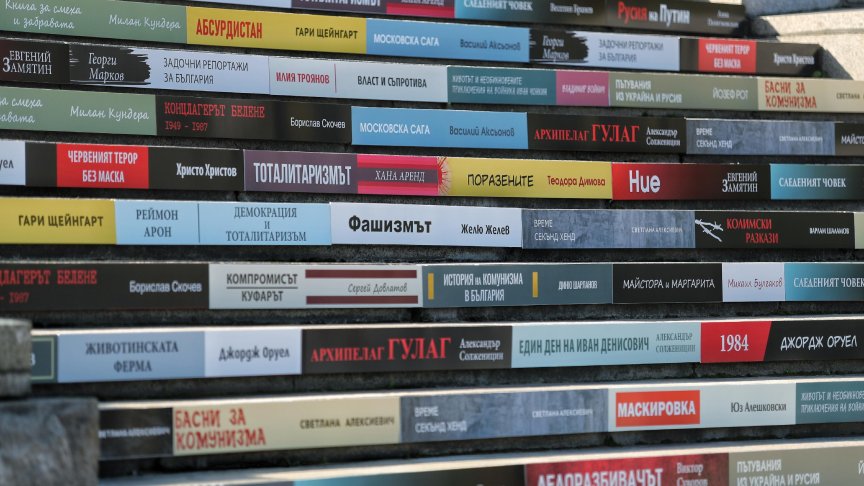 На стълбите пред монумента са поставени книжни заглавия, сред тях - "Архипелаг Гулаг" на Александър Солженицин, "1984" на Джордж Оруел и "Басни за комунизма" на Славенка Дракулич.