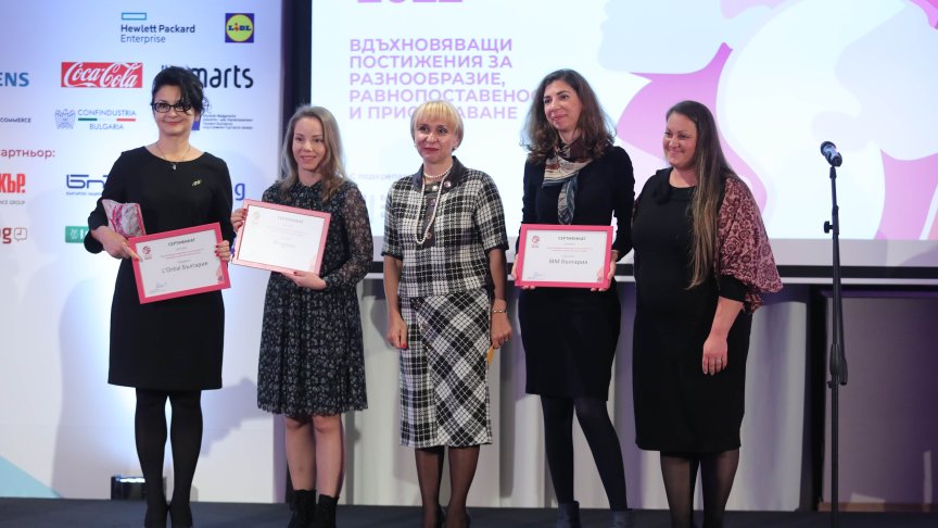 Аксенчър България и VMware България са отличените компании в категория вдъхновяваща инициатива за разнообразие, равнопоставеност и приобщаване на работното място. УниКредит Булбанк е победителят в категория вдъхновяваща инициатива на работодател в подкрепа на работещите родители, на семейството и децата. Интерланг и Фондация живот със синдром на Даун грабнаха приза за вдъхновяваща инициатива за преодоляване на стереотипните нагласи и приобщаване на малцинствените групи и хора с увреждания съответно в стопански и в нестопанския сектор. L’Oréal България триумфира в категория вдъхновяваща инициатива за овластяване на следващото поколение жени таланти. Престиж бе обявена за компания шампион в представяне на жени на ръководни и лидерски позиции.