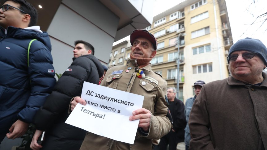 Докато директорът на театъра даваше пресконференцията пред журналисти, отвън пред сградата се проведе поредният протест в защита на Александър Морфов.