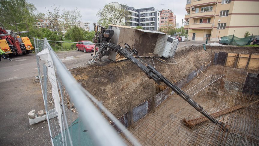 Камион с кран се обърна в строеж в столичния квартал "Левски В" на ул. "Станислав Доспевски". Доставял е арматура.