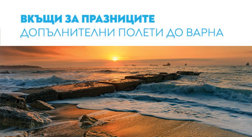 В навечерието на коледните и новогодишни "България Еър" увеличава честота на вътрешните си полети по линията София – Варна, с които дава възможност на пътниците да прекарат вълнуващите празници със своите близки, семейство и приятели. С въвеждането на допълнителните полети от София до Варна и обратно през декември клиентите на авиокомпанията могат да летят до 3 пъти на ден до морската столица и имат повече удобни опции за пътуване преди празниците като избегнат и засиления трафик по пътищата. Пътниците могат да пътуват комфортно към своята дестинация или да се приберат вкъщи за празниците по-бързо и удобно със самолет на националния превозвач.