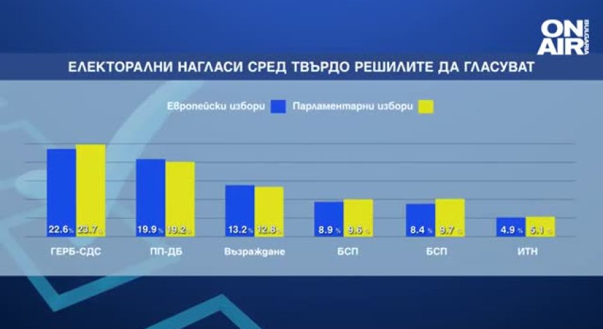 "Алфа Рисърч" тества и електоралните нагласи. ГЕРБ-СДС водят класацията. За тях вота си биха дали почти 24% от избирателите. С повече от 5% по-слаб е резултатът за "Продължаваме промяната - Демократична България". Трета политическа сила в бъдещ парламент ще е "Възраждане" - събират почти 13 процента от вота. ДПС и БСП са с почти еднакъв резултат. "Има такъв народ" е с резултат от 5%.