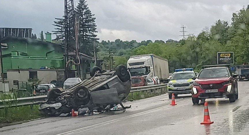 Тежка катастрофа при Владая. Кола самокатастрофира и е по таван на пътя в посока София.
