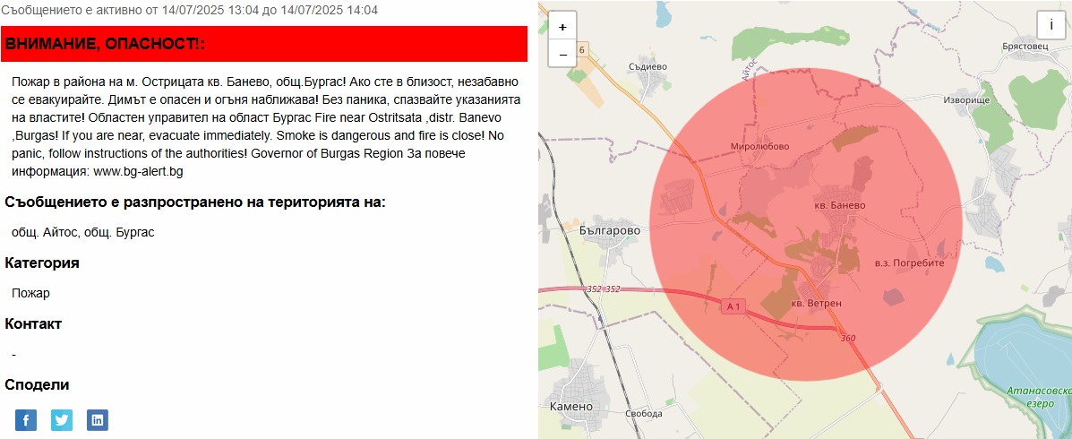 "Пожар в района на м. "Острицата" кв. Банево, общ. Бургас! Ако сте в близост, незабавно се евакуирайте. Димът е опасен и огънят наближава! Без паника, спазвайте указанията на властите", пише в съобщението, разпратено на хората в района на пожара.