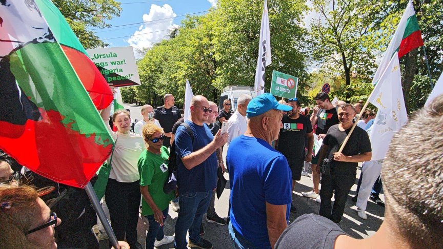 Протест пред входа на завода в Сопот срещу посещението на Урсула фон дер Лайен, организиран от партия "Възраждане". Демонстрацията прерасна в конфликт, а един от протестиращите бе задържан.