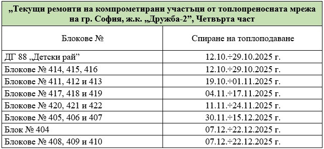 "Топлофикация София" съобщи, че ремонтът в столичния квартал "Дружба“ 2 ще стартира с монтиране на спирателна арматура, заради която се предвижда спиране на топлоподаването за целия квартал "Дружба-2“ и комплекс „Цариградски“ за периода от 2.10. до 6.10.2025 г.