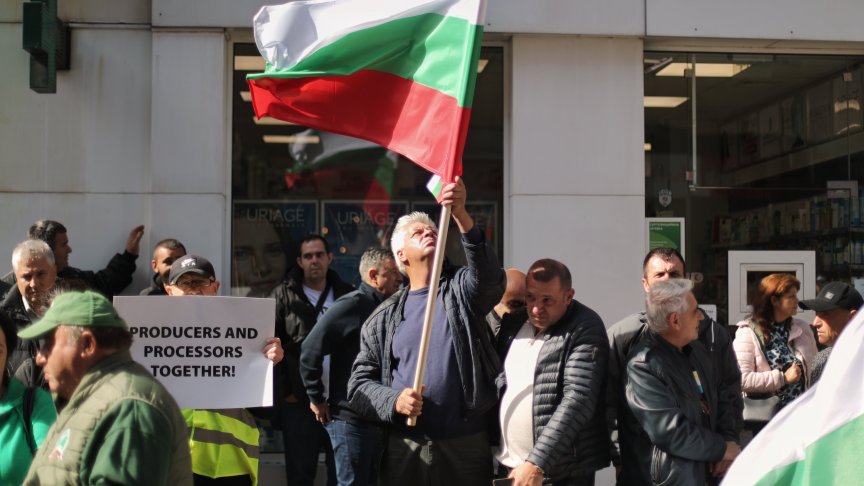 Земеделски производители излязоха протест в защита на българското производство. Демонстрацията се провежда пред сградата на Европейския парламент в София.