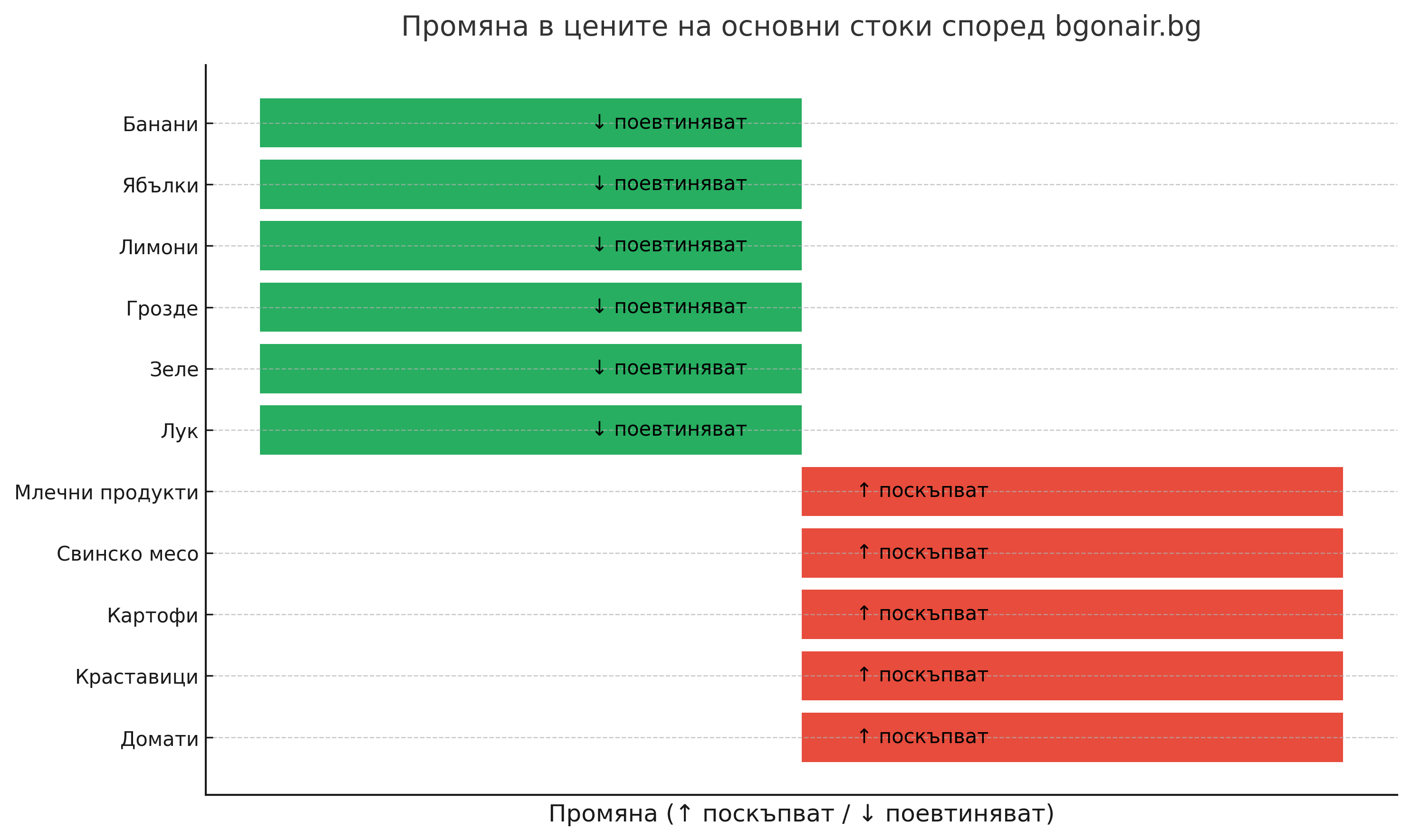 За изминалата седмица поевтиняват лукът, зелето, гроздето, лимоните, ябълките, бананите. Има ръст при цената на доматите и при краставиците.