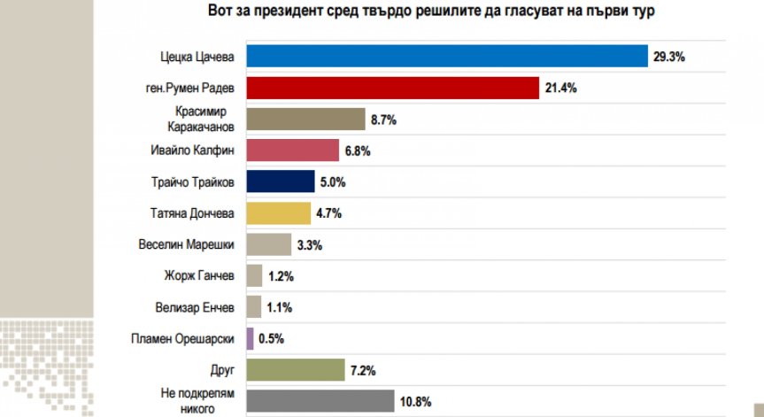 Бъдещият президент на България ще бъде излъчен на балотаж, с голяма вероятност – между кандидата на ГЕРБ г-жа Цецка Цачева и на подкрепения от БСП Румен Радев. Сред твърдо решилите да гласуват Цачева стартира с електорална преднина пред Радев от 7.9%. Това показват данни от изследване на "Алфа Рисърч", проведено в периода 08 – 13 октомври 2016 г.