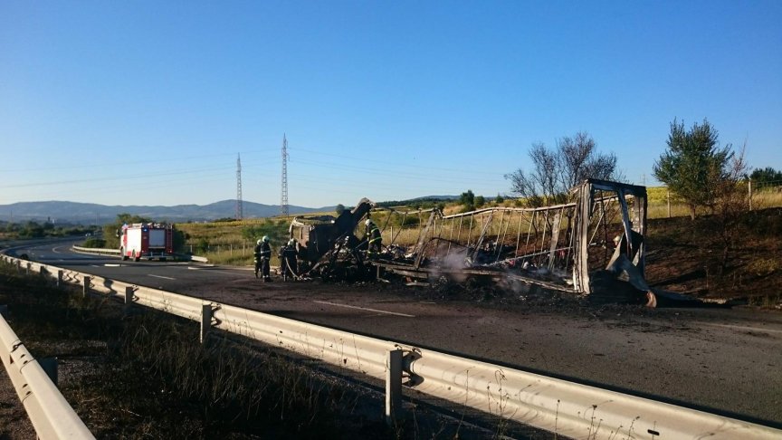 ТИР се запали на АМ "Струма" преди входа за София, близо до село Драгичево. Очевидци са чули няколко взрива.
