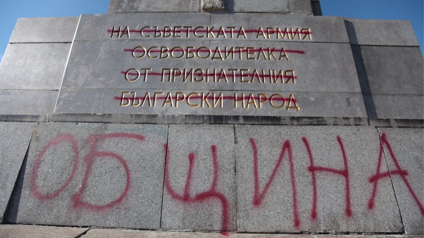 Червен спрей покрива надписа с благодарности към Съветската армия. А отдолу има призив към Столичната община паметникът да бъде премахнат.