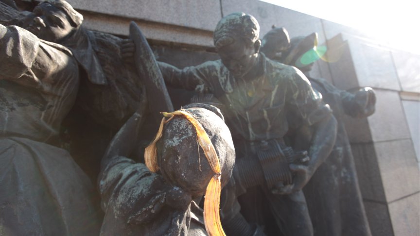 Червен спрей покрива надписа с благодарности към Съветската армия. А отдолу има призив към Столичната община паметникът да бъде премахнат.