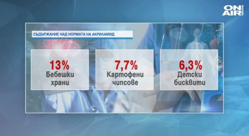 От проучването на "Активни потребители" става ясно, че 13% от тестваните бебешки храни са показали отклонения над допустимата граница, при картофените чипсове – 7.7 %, а при бисквитите за кърмачета и малки деца – 6.3%.
