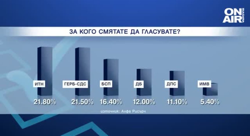 Според данните от проучването, подкрепата за "Има такъв народ" е 21,8%, за ГЕРБ е 21.5 на сто, трети са БСП с 16,4%.