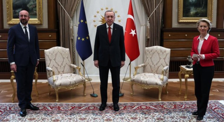 По време на официална среща в Анкара, ръководителят на Еврокомисията беше принудена да седне на диван, защото свободното място до турския президент Реджеп Ердоган неуместно беше заето от нейния колега Шарл Мишел.