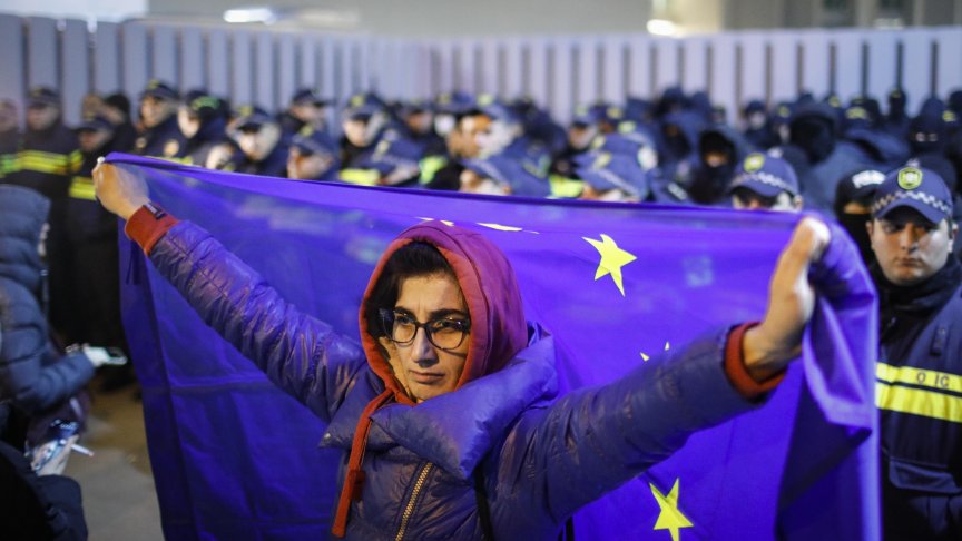 Изпълнена с насилие нощ в Грузия. Хиляди разгневени хора излязоха по улиците на по-големите градове на протести срещу правителството, което замрази преговорите за членство в ЕС.